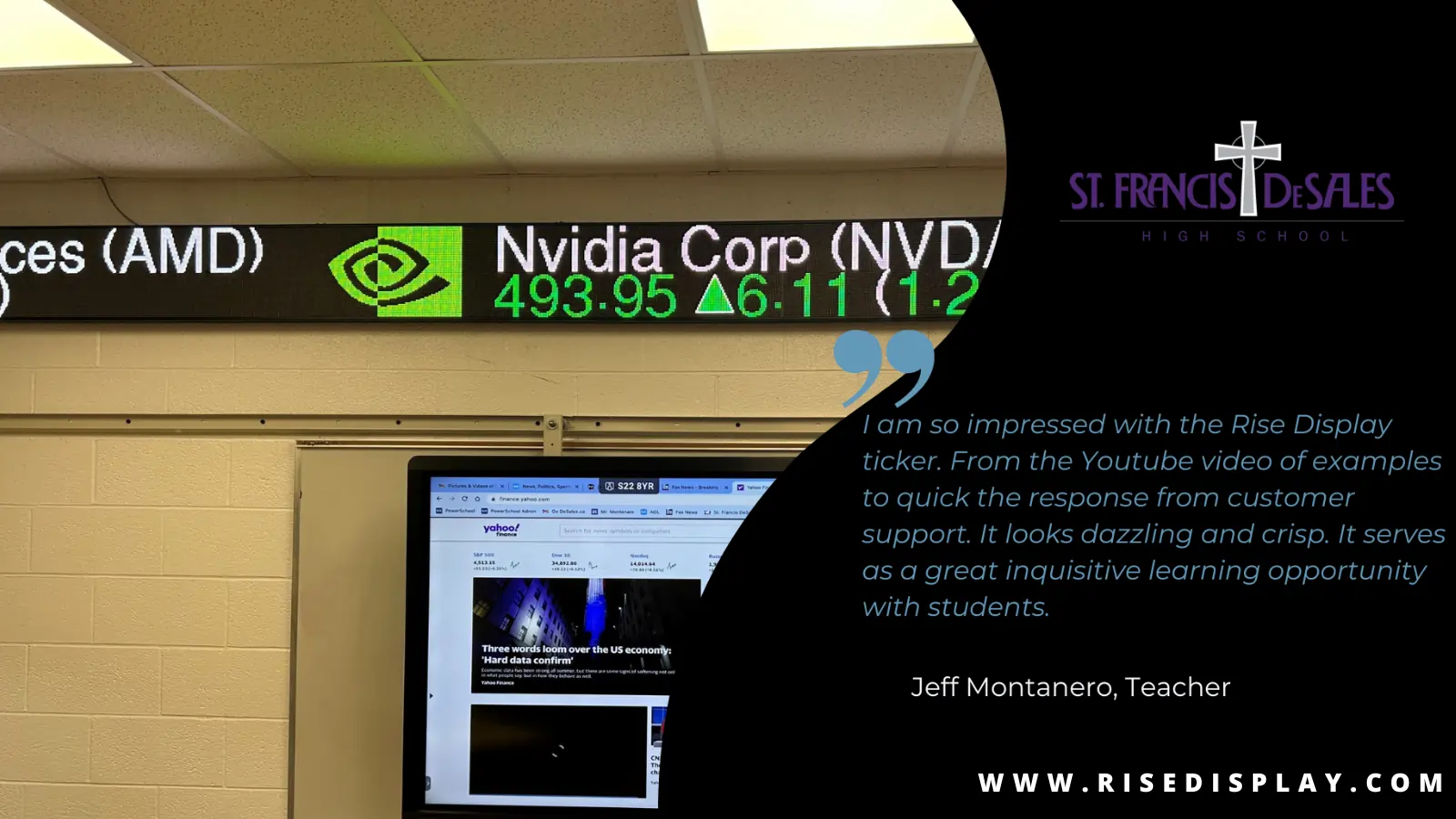 We have our own Rise Ticker App and licenses with financial and sports providers for the live content. Once a ticker is connected to your network (wired or wireless), your firewall must allow outbound TCP/IP access to cms.risedisplay.com via port 9090 to receive the live updates. No dedicated computer equipment is required. All of the “smarts” are built into the ticker display. More network setup info.